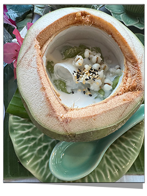 เมื่อทานเมนูหลักกันไปแล้ว พวกเราก็ได้ชิมขนมหวานประจำร้าน หาทานที่อื่นได้ยาก "ขนมเปียกปูนสด บรรจุในลูกมะพร้าว มีลูกเดือย และน้ำกะทิโรยหน้า " อร่อย ฟินๆ รสชาติกลมกล่อม ไม่หวานเกินไป