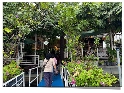 เรือใช้เวลาเพียง 5 นาที จากฝั่ง มาจอดเลียบเรือร้านอาหาร อ้อยหวาน ซึ่งตั้งติดริมแม่น้ำ บรรยากาศร้านตกแต่งด้วยต้นไม้ ดอกไม้ สีสันสวยงาม หวานสมชื่อกับร้านทีเดียว