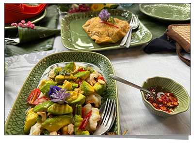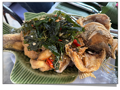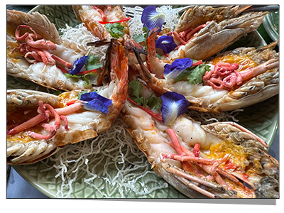 พวกเรารีบไปนั่งโต๊ะด้านใน เพื่อชิมอาหารมื้อกลางวัน แต่เกือบบ่ายโมง เมนูส่วนใหญ่ เป็นเมนูซิกเนเจอร์ของร้าน ที่แม่ครัวเตรียมไว้ อาทิ กุ้งตัวโตเผา อโวคะโดยำ ไข่ห่อเขียวหวานซีฟู้ด ปลากระพงทอด ผัดผักสด ตามด้วยข้าวสวย นุ่มหอม