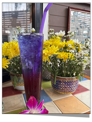 ร้านนี้ครีเอทบริเวณร้าน ทั้งโต๊ะอาหาร อาหารและเครื่องดื่ม ด้วยดอกกล้วยไม้ และดอกไม้สีสด ดูเพลินตา และรู้สึกสบายใจ